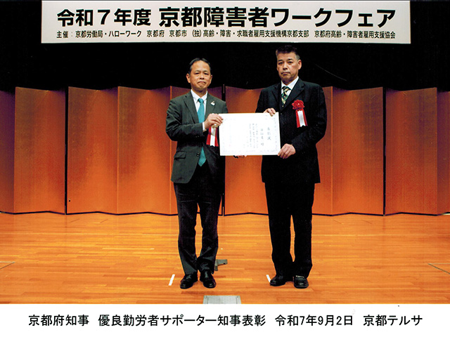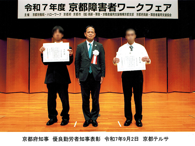 - 令和7年京都障害者ワークフェアにおいて、弊社社員が「優良勤労者サポーター知事表彰」及び「優良勤労者知事表彰」を受けました。