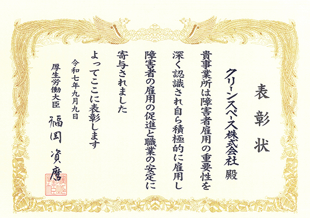 - 「令和7年度障害者雇用優良事業所厚生労働大臣表彰」を頂きました。